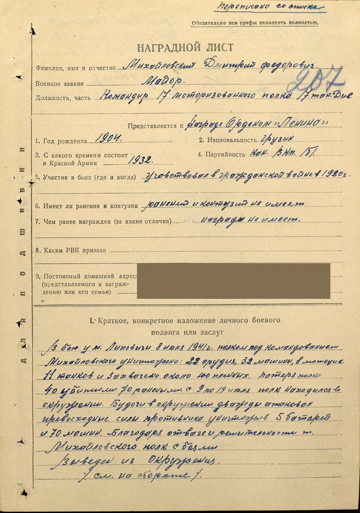 Наградной лист, составленный на командира 17-го мотострелкового полка 17-й танковой дивизии майора Михайловского Дмитрия Федоровича.