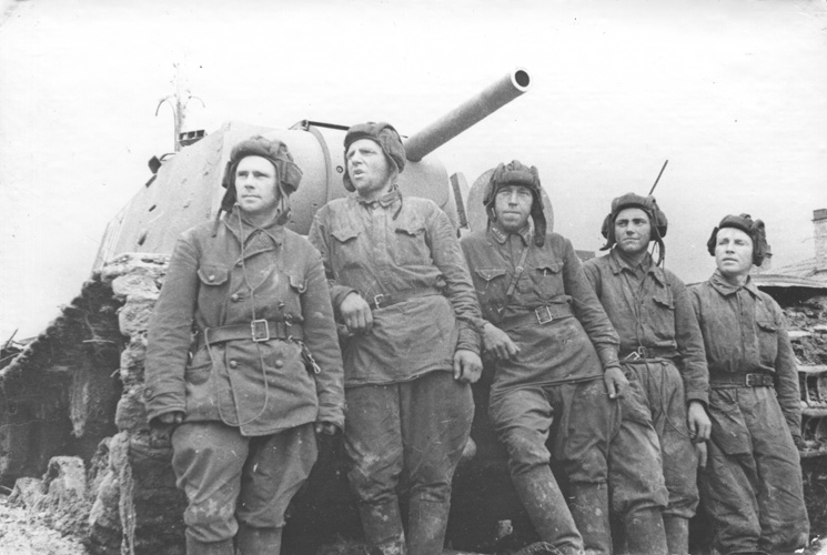 В составе экипажа слева направо: командир танка младший лейтенант Ф.Морозов, старшина Н.Николаев, старшина П.Байков, сержант Л.Емелин, сержант Н.Густягов.