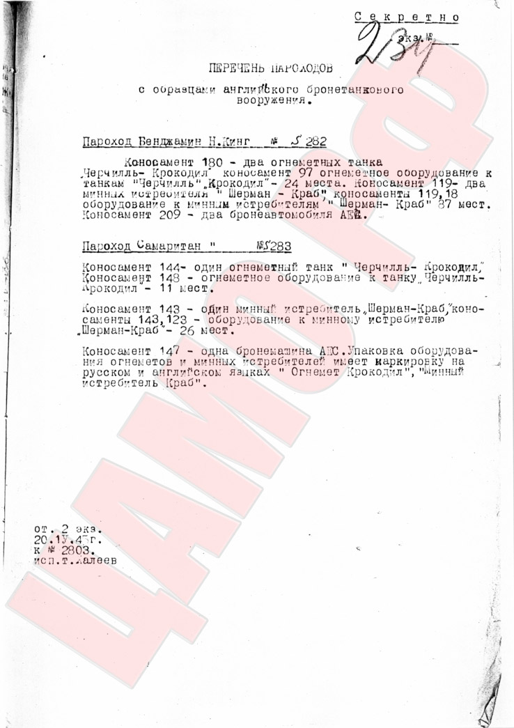 Выяснил. "Крокодилы" прибыли в апреле 1945г на судах каравана №66 через северные порты. Если они не принимались ГАБТУ, то почему в одних документах говорится о принятии в 1943г 169 "Черчиллей" , а в других - 174-х ?