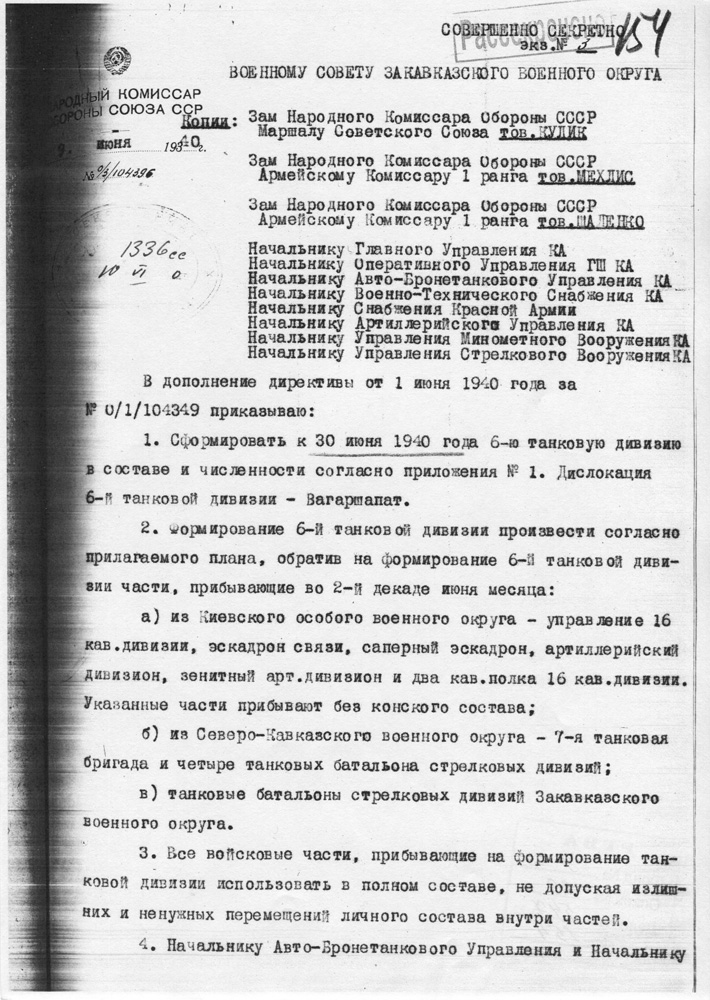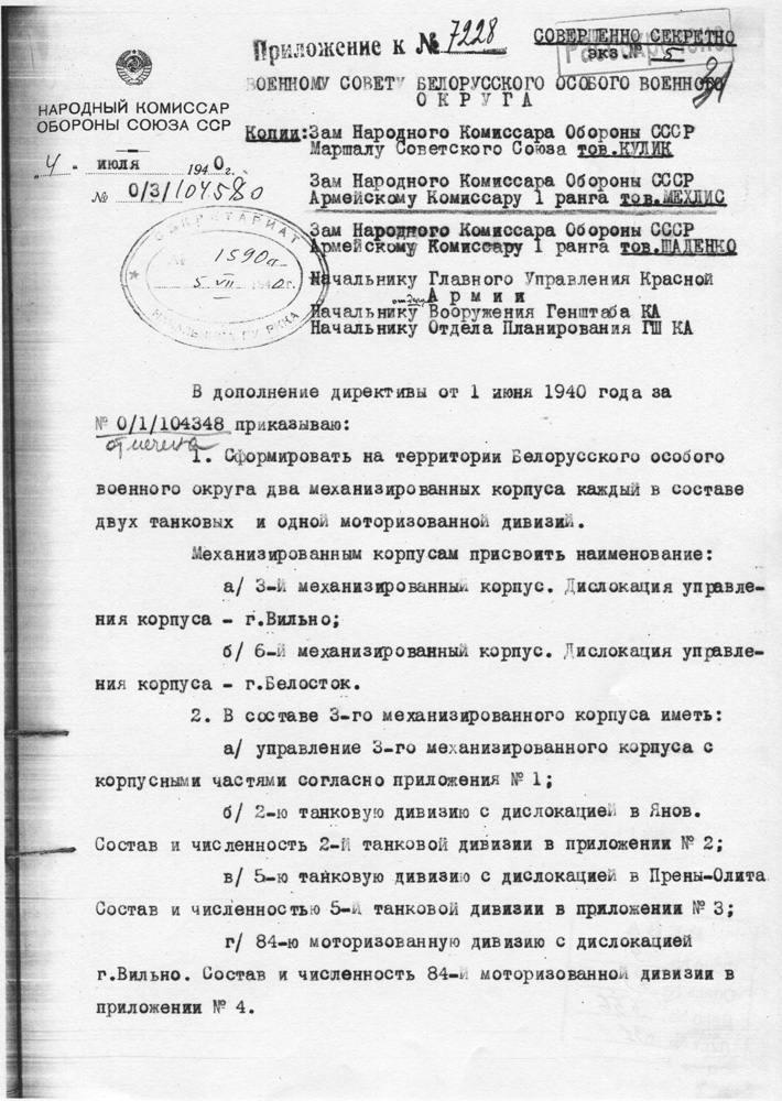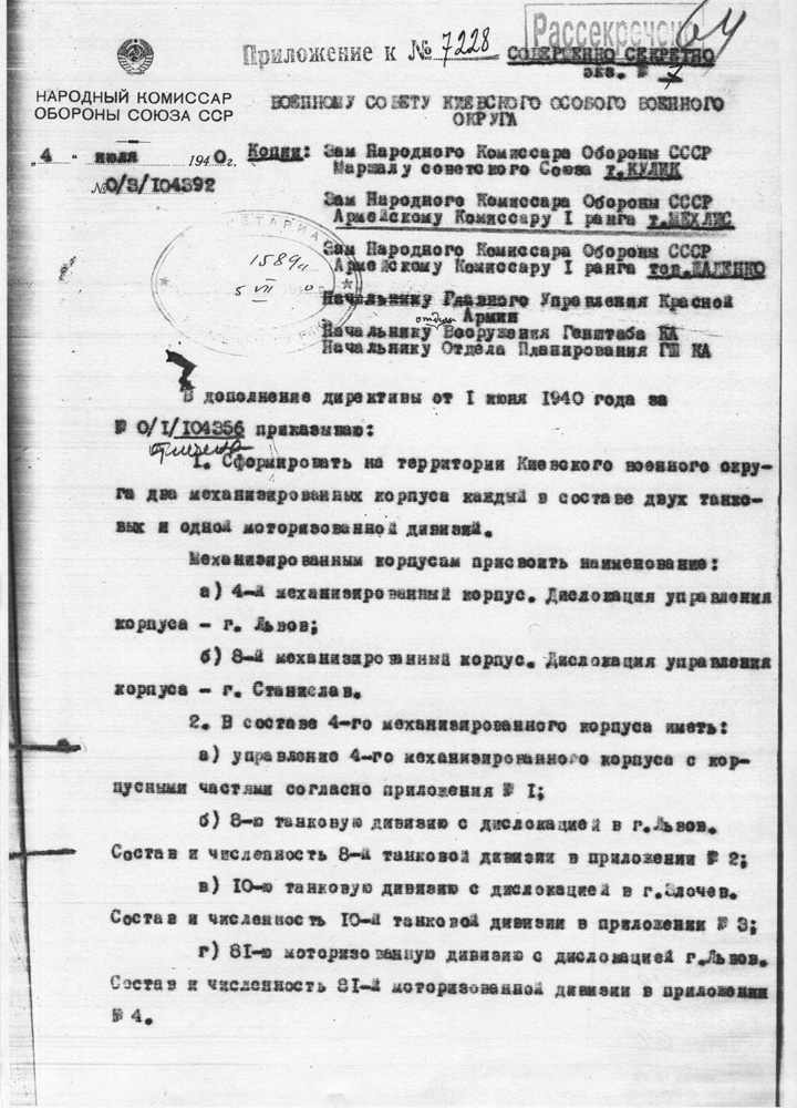 Первые страницы директив на формирование механизированных корпусов и отдельных танковых дивизий летом 1940 г.