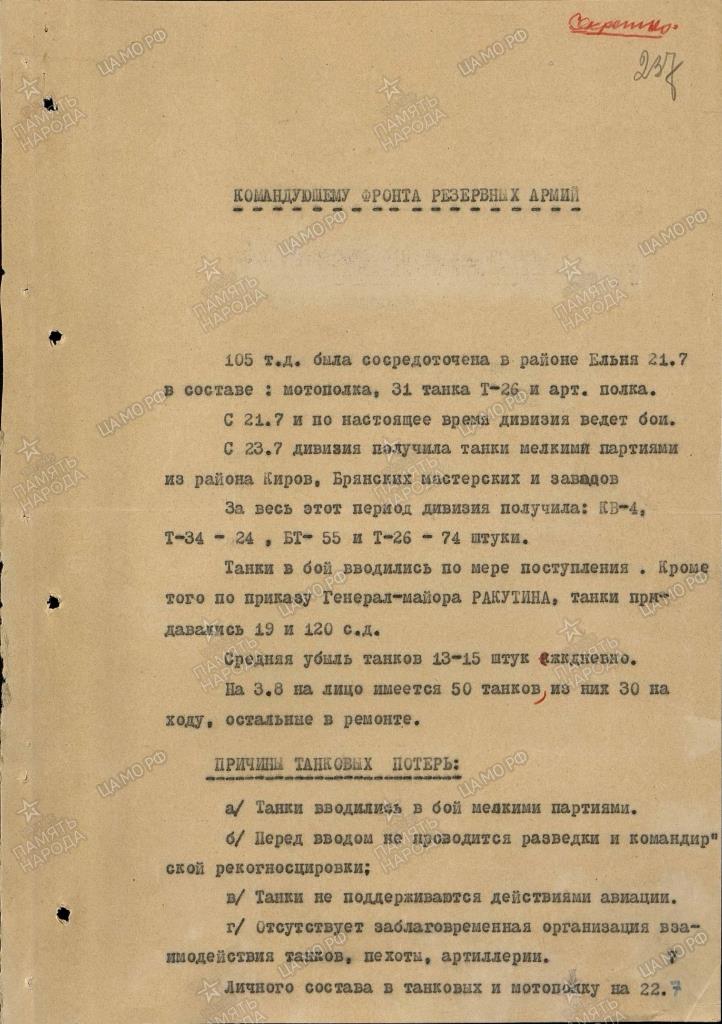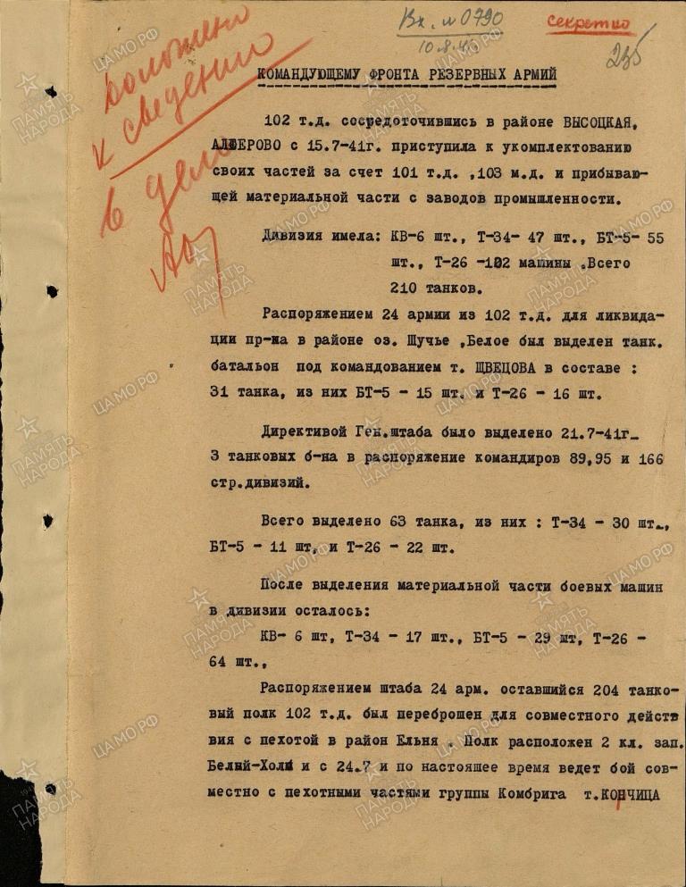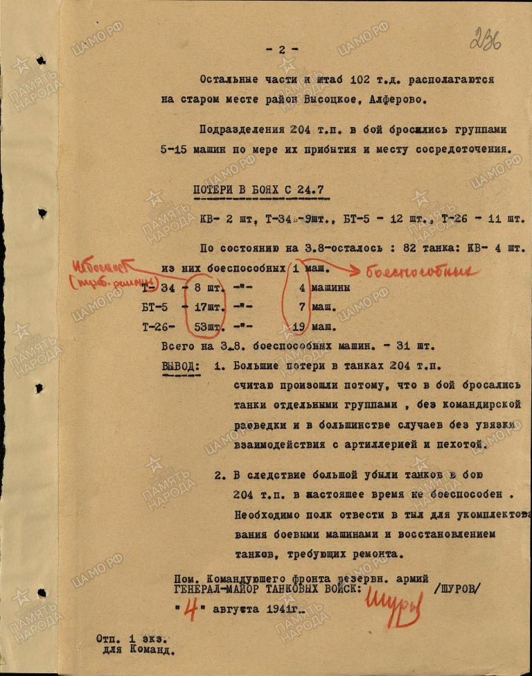 до 1 августа получила кв 6. т-34 47. бт-5 30 машин. т-26 102( получила из 52 тд) т-37/38/40 7.