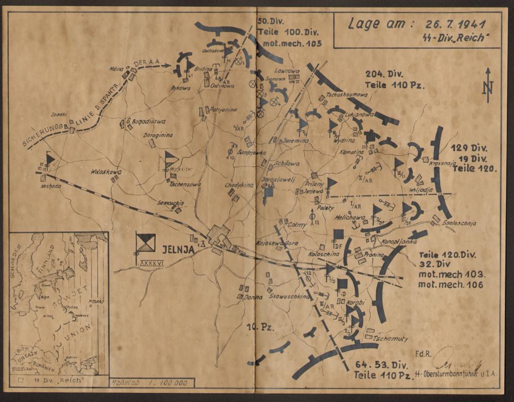 Довольно редкая карта из книги по дивизии СС "DR". Почти все эти дивизии на карте присутсвуют, не стал ничё исправлят, кому надо-сам разберется :) Очевидно д.б. "204 ТП" и "110 ТП". В остальном довольно точно, 50 сд была, уточнил в описании Лубягова- как раз ее полк прибыл 26 июля под Ельню. От 100 сд тоже был один полк, все месте образовывали "северную группу комбрига Кончица".