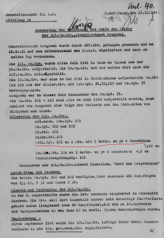 Историю 101 тд можно опустить. Вот интересный момент-- артиллерия дивизии. Мозговой утверждал, что в артполку был один 3-х батарейный дивизион и в каждой батарее было 4 х7.62 cm орудия ! Очень нетипичный состав..