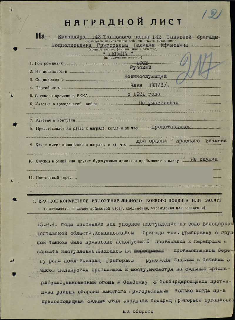 142-го танкового полка 142-й танковой бригады (I) . В данном случае, кроме уже "стандартных" в этой теме наградных листов, я могу подтвердить данную информацию и учетно-послужной карточкой генерал-майора танковых войск В.Е.Григорьева, который был назначен на эту должность приказом НКО СССР № 02473 от 3.09.41 г.