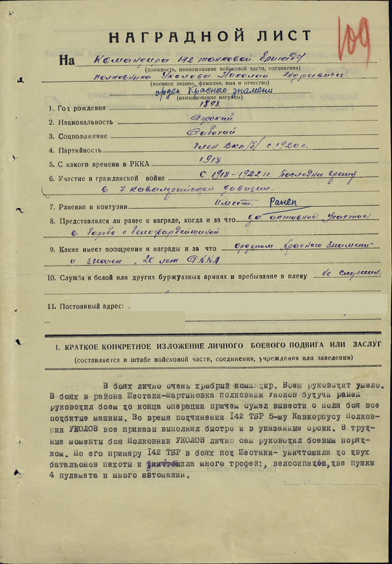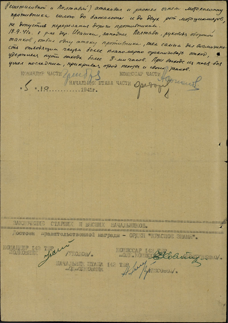 142-й танковой бригадой (I) ? Ну как минимум есть на то две причины. Во-первых, есть наградной лист на него на "Подвиге народа" (вот уж, сложно умалить значение его как источника), как на командира 142-й танковой бригады, руководившего боем бригады в районе Шестаки-Мартыновка, подписанный командиром 5-го кавалерийского корпуса генерал-майором Камковым. Во-вторых, есть наградные листы, подписанные им и именно как командиром 142-й танковой бригады! Правда, уже в первых числах октября, но будь он на Западном фронте в 143-й танковой бригаде, попавшей под "каток" начавшегося немецкого наступления, ему было бы не до наградных листов.