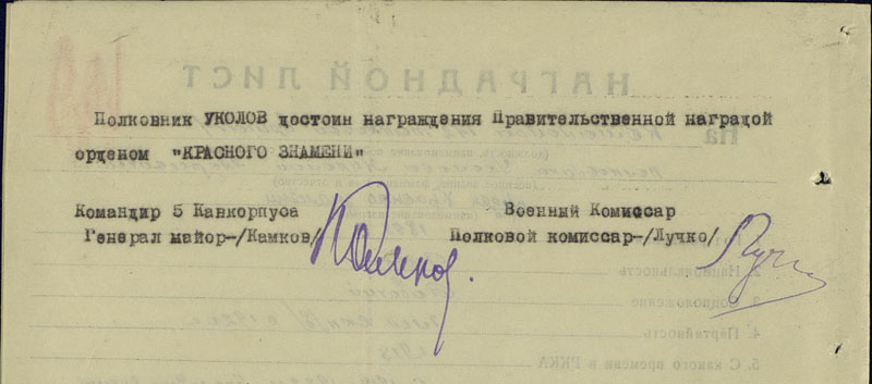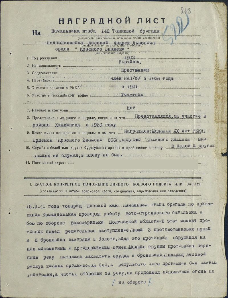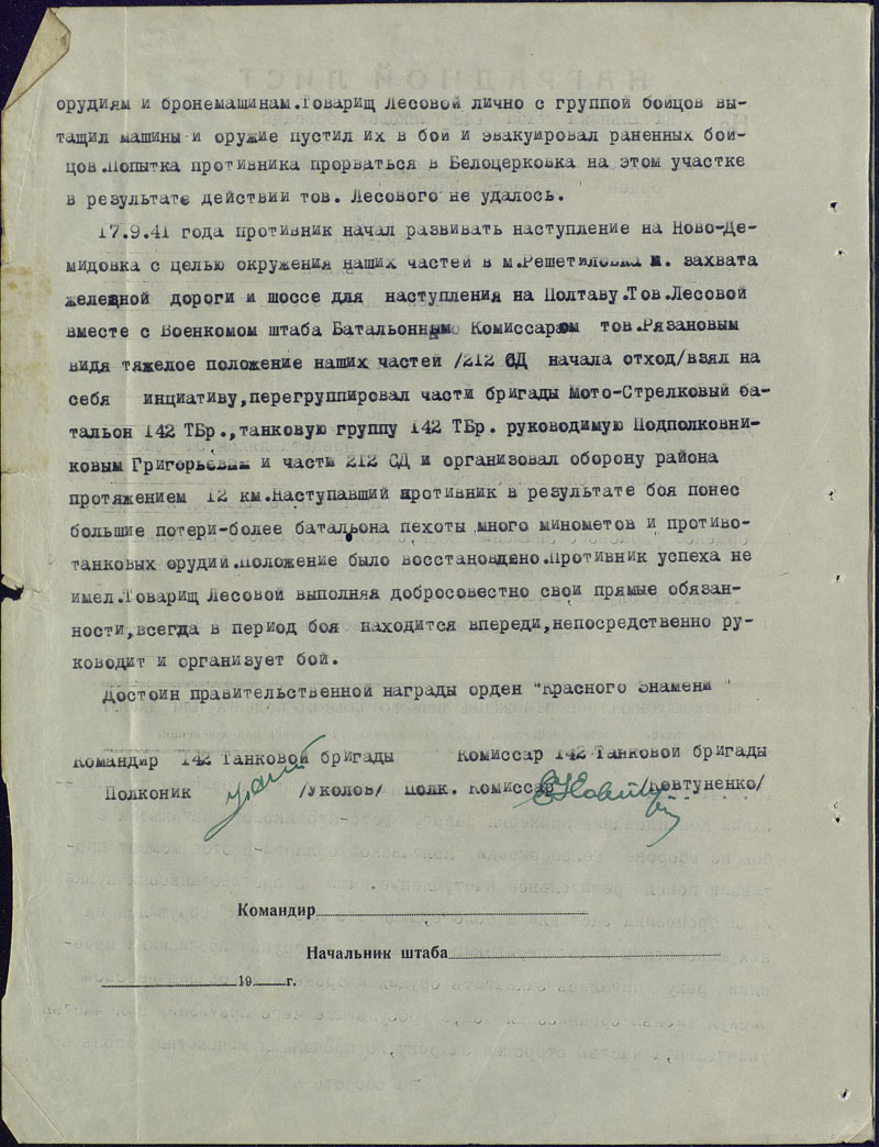 Как начальник штаба наградные подписывал подполковник Лесовой Андрей Львович. Отличившийся в боях у реки Халхин-Гол командир 7-й мотоброневой бригады, в октябре 1940 г. он был зачислен слушателем Военной Академии Генштаба. Однако проучиться удалось лишь год. Как и многих других командиров его набора подполковника Лесового отправили на фронт. 15 сентября 1941 г. он отличился в районе Белоцерковки, а 17 сентября - в районе Ново-Демидовки, где он с военным комиссаром штаба батальонным комиссаром Рязановым Вениамином Амосовичем организовал успешную оборону на участке в 12 км. Правда, с 212-й стрелковой дивизией полковника В.В.Бардадина, которая когда-то была моторизованной и входила в состав 15-го механизированного корпуса.