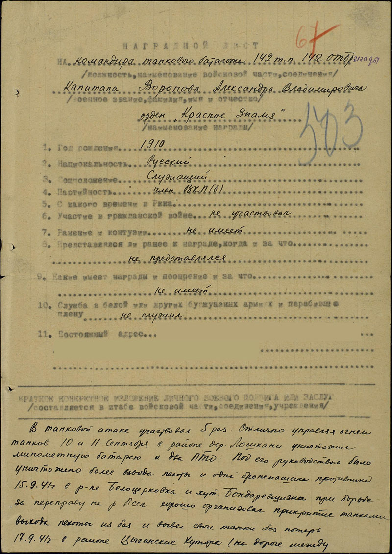142-й танковый полк был трехбатальонного состава, но пока ясен только один комбат - капитан Александр Владимирович Воронов, награжденный за бои в сентябре 1941 г. орденом "Красное Знамя".