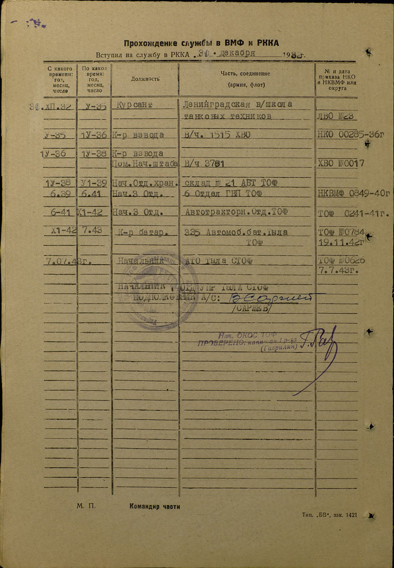 12.12.1940 – 21.06.1941 – пом. командира 73 арт. дивизиона 3 стрелковой бригады ВО ВМБ ТОФ по хозяйственной части;