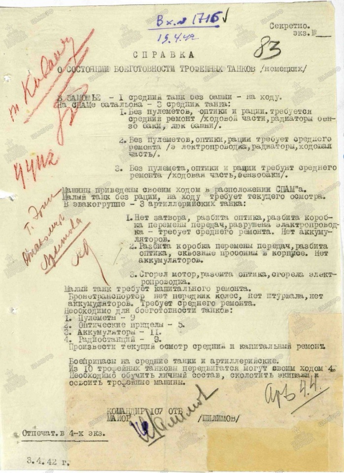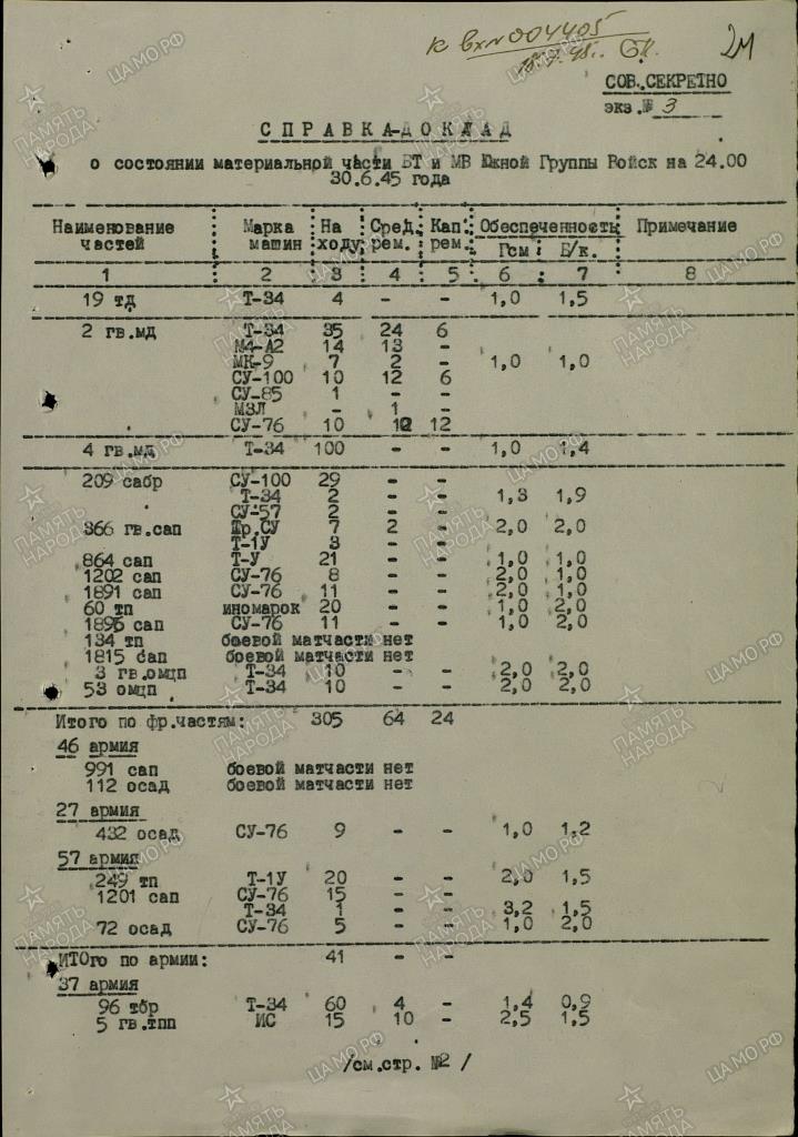 «Во исполнение приказа командующего БТ и MB 18-й армии принят батальон трофейных танков, сосредоточенный: на южной окраине Нижней Нзмецке — три танка и тылы батальона, четыре танка в Ужгороде (три не заводятся и один требует среднего ремонта) и шесть танков находятся в бою за Тарновце».