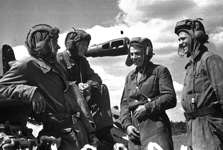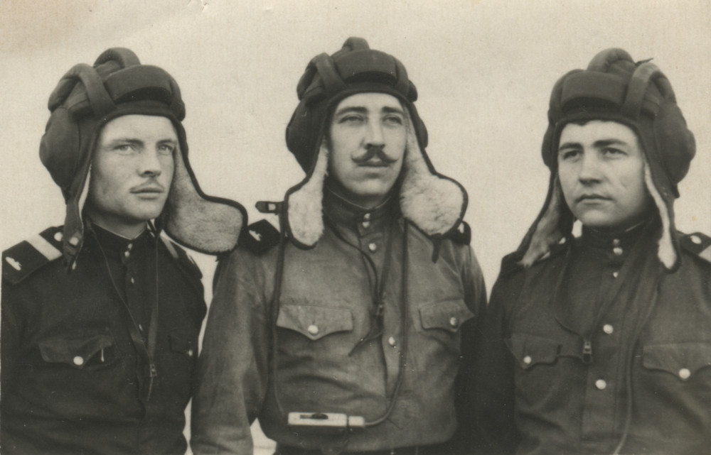 На фото экипаж СУ-76 в двух разных типах шлемов. Трое в показанном выше, у которого наушник-клапан на пуговицах, и один - в шлеме с круглыми глухими наушниками.