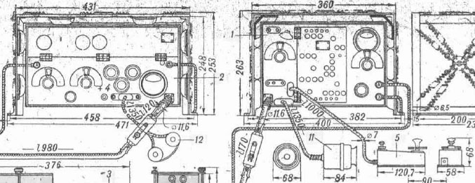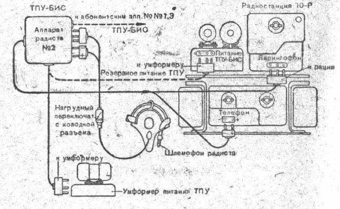 Рисунок радиостанции 9-РС, без использования ТПУ. Видно, что обе вилки шлемофона воткнуты в розетки в правой стенке корпуса радиостанции.