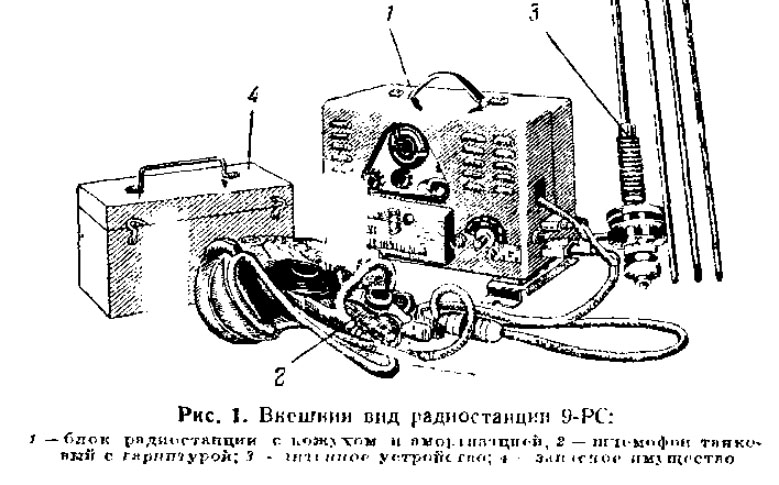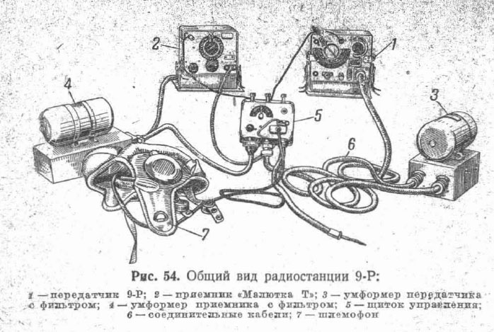 В комплект радиостанции 9Р обр.1941 г. входили приемник РСИ-4Т (по типу авиационного), передатчик, шлемофон и т.д.