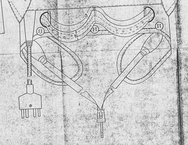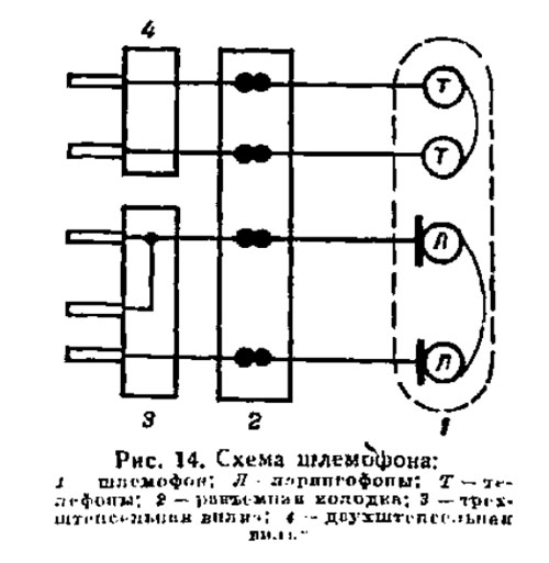 Схема шлемофона. Видно, что всего две вилки, у ларингофонов - трехштырьковая, у телефонов - двухштырьковая.