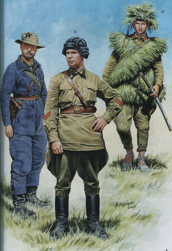 В свое время в журнале М.Коломийца, посвященном боям у реки Халхин-Гол, был помещен этот рисунок А.Каращука, на котором изображены в цвете три советских танкиста.