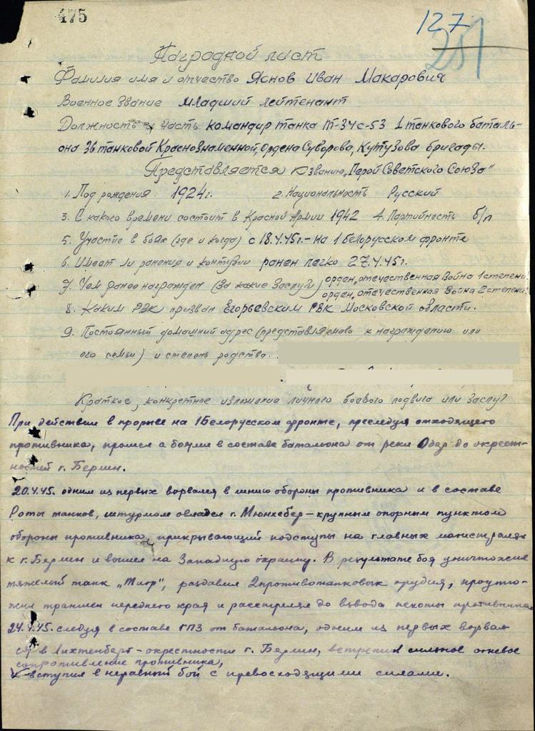 Яснов Иван Макарович. 11.04.1924 - 28.12.1946. 36-я Гвардейская Нижнеднепровская Краснознамённая, орденов Суворова II ст. и Кутузова II ст. танковая бригада. Снайпер-танкист. http://www.tankfront.ru/ussr/tbr/tbr036.html Награждён орденами Отечественной войны 2-й степени (25.02.1945) и 1-й степени (02.03.45 приказ 041/н от 09.04.1945), Ленина (Указ ПВС СССР от 31 мая 1945), медалью "Золотая Звезда" Героя СССР. Подробнее здесь - http://www.warheroes.ru/hero/hero.asp?Hero_id=3885