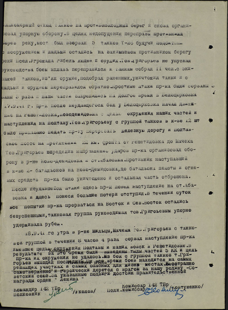 142-й танковой бригадой (I) ? Ну как минимум есть на то две причины. Во-первых, есть наградной лист на него на "Подвиге народа" (вот уж, сложно умалить значение его как источника), как на командира 142-й танковой бригады, руководившего боем бригады в районе Шестаки-Мартыновка, подписанный командиром 5-го кавалерийского корпуса генерал-майором Камковым. Во-вторых, есть наградные листы, подписанные им и именно как командиром 142-й танковой бригады! Правда, уже в первых числах октября, но будь он на Западном фронте в 143-й танковой бригаде, попавшей под "каток" начавшегося немецкого наступления, ему было бы не до наградных листов.