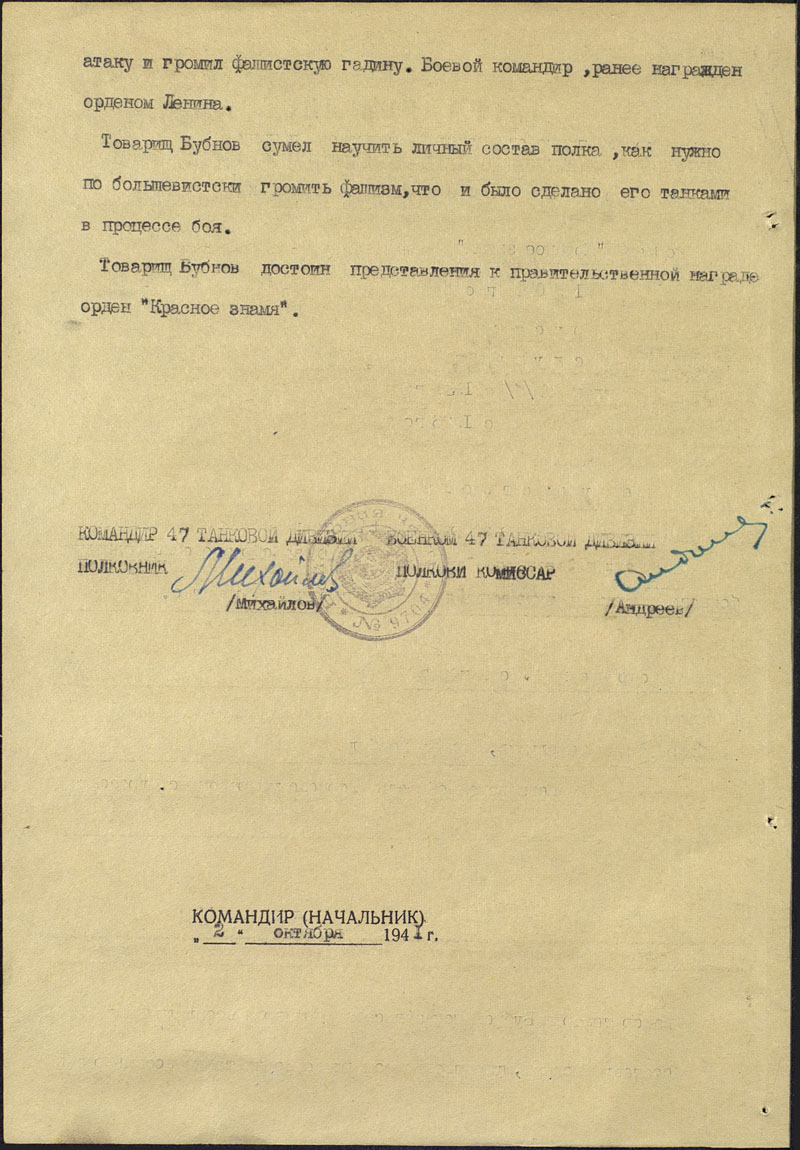 Как начальник штаба наградные подписывал подполковник Лесовой Андрей Львович. Отличившийся в боях у реки Халхин-Гол командир 7-й мотоброневой бригады, в октябре 1940 г. он был зачислен слушателем Военной Академии Генштаба. Однако проучиться удалось лишь год. Как и многих других командиров его набора подполковника Лесового отправили на фронт. 15 сентября 1941 г. он отличился в районе Белоцерковки, а 17 сентября - в районе Ново-Демидовки, где он с военным комиссаром штаба батальонным комиссаром Рязановым Вениамином Амосовичем организовал успешную оборону на участке в 12 км. Правда, с 212-й стрелковой дивизией полковника В.В.Бардадина, которая когда-то была моторизованной и входила в состав 15-го механизированного корпуса.