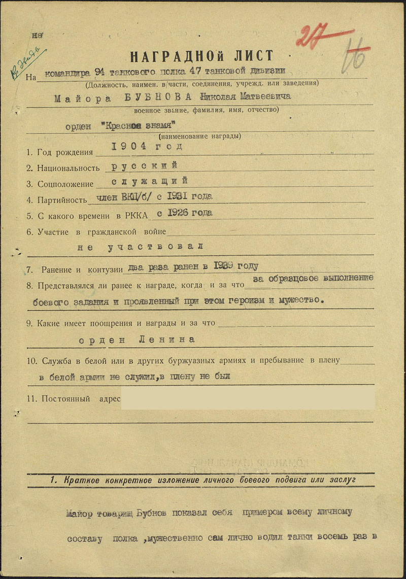 142-го танкового полка 142-й танковой бригады (I) . В данном случае, кроме уже "стандартных" в этой теме наградных листов, я могу подтвердить данную информацию и учетно-послужной карточкой генерал-майора танковых войск В.Е.Григорьева, который был назначен на эту должность приказом НКО СССР № 02473 от 3.09.41 г.