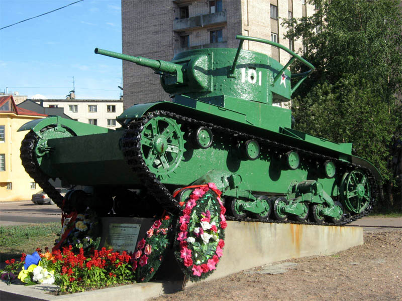 2. Так же на завершающем этапе войны, со 2 по 12 марта 1940г в Выборгском заливе, у островов Туппурансаари,Тейкаринсаари и Тронгзунд затонули 12 танков Т-26 различных модификаций из состава 62-го (5 машин) и 63-го (7 машин) ЛТП 7-й Армии Северо-Западного фронта. Из всех машин 30.03.2005г был поднят один танк Т-26 (обр. 1933г радийный, №4480) с останками членов экипажа. Танк принадлежал 1-му батальону 63-го легкотанкового полка и затонул 7.03.1940г, наскочив на воронку во льду. Машину отремонтировали на Выборгском судоремонтном заводе и 21.06.2005г установили в качестве памятника на проспекте Победы в г.Выборг.