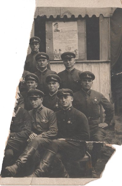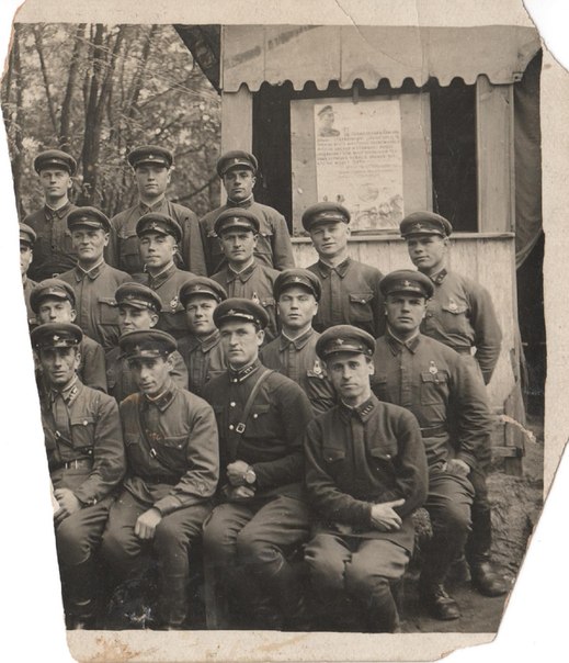 Первое фото в период службы в армии (единственное из подписанных) - после танковых учений г. Киев, 1936. На фото он рядовой и на петлицах нет ни одного треугольника. На другом фото (снято осенью - судя по панораме заднего вида - деревья почти без листьев) - на петлицах 2-а треугольника, но "Рикардо" на петлицах нет. На третьем фото - в казарме - "Отдельный командир" 3-и треугольника и появляется эмблема. Получить три звания надо прослужив какое-то время. Мне, например, в СА сержанта дали через 1,5 года службы.