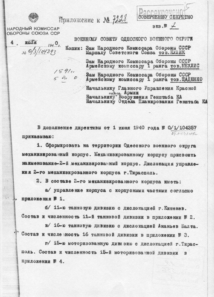 Первые страницы директив на формирование механизированных корпусов и отдельных танковых дивизий летом 1940 г.