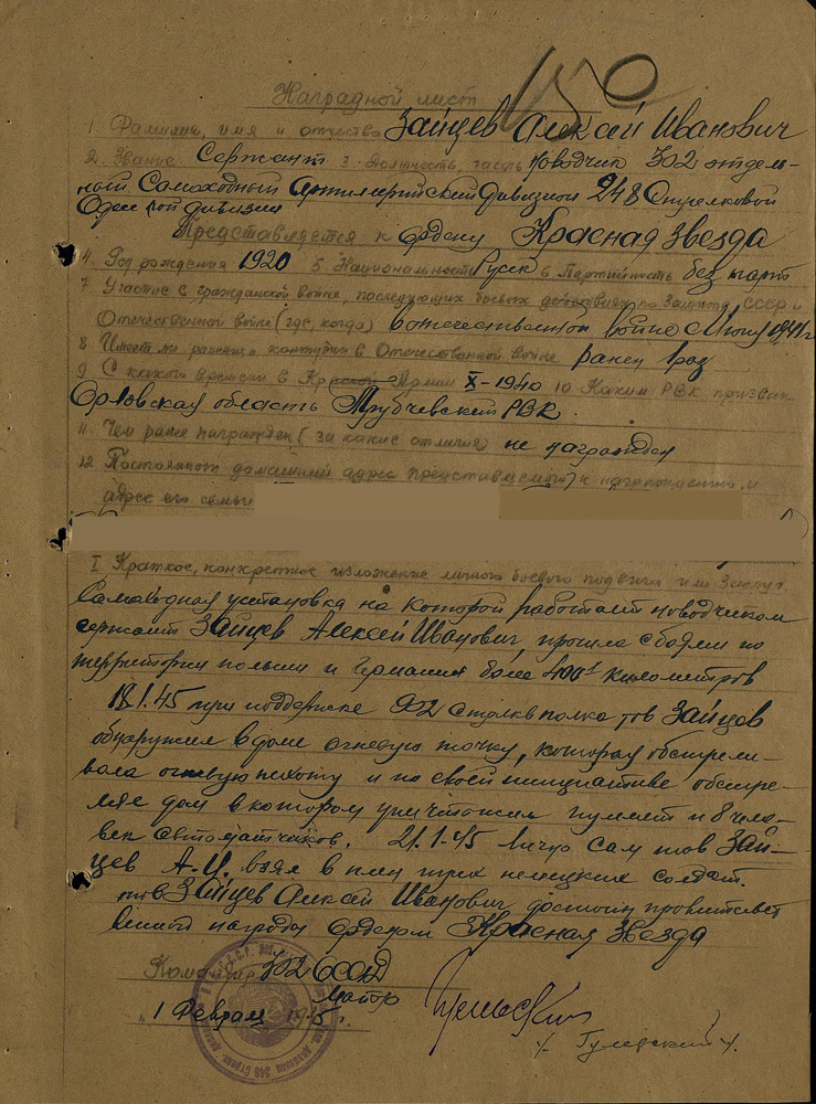 В 1945 г. он служил в 302-м отдельном самоходно-артиллерийском дивизионе 248-й стрелковой дивизии. Это явно нигде не написано, но те персоналии, что удалось определить по ПН, именно оттуда.
