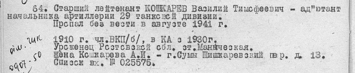 Кошкарев Василий Тимофеевич, 1910 г.р., место рождения - Ростовская обл., ст.манычевская, член ВКП (б), в РККА с 1930г.,