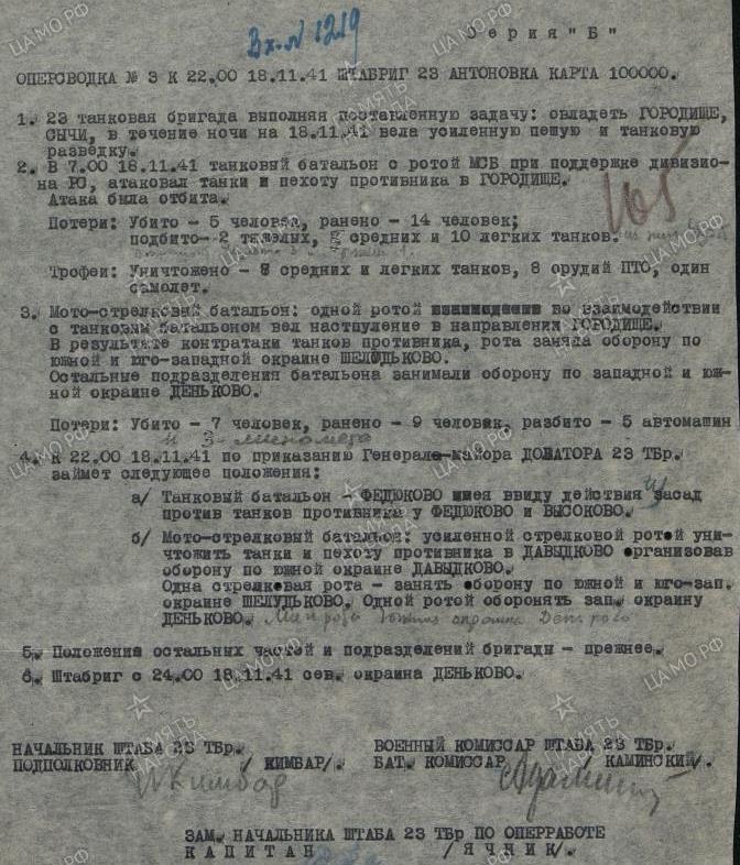 "В 7.00 18.11.41 танковый батальон с ротой МСБ при поддержке дивизиона РС, атаковал танки и пехоту в Городище. Атака отбита.