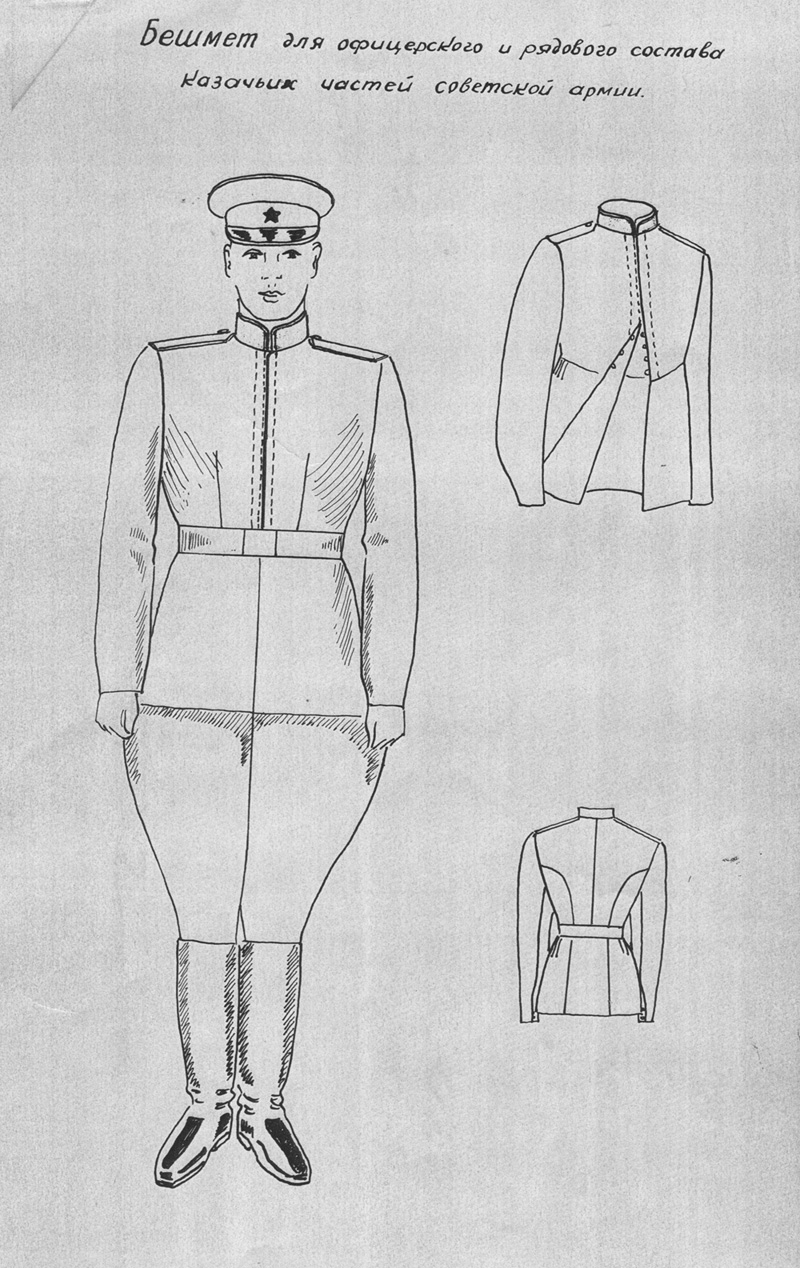 Под черкеской: бешмет цвета хаки, без каких-либо цветных элементов, и шаровары так же хаки. В случае утраты бешмета боец носил под черкеской обычную гимнастерку.