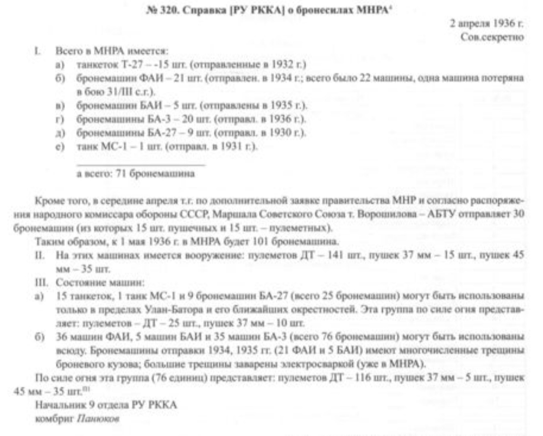Начальник 9-го отдела Разведупра РККА комбриг Понюков письмом за №91746 от 10 декабря 1936 г. препроводил нам сводную ведомость на отправленное Вами в 1936 г. в Улан-Удэ авто-броне имущество.